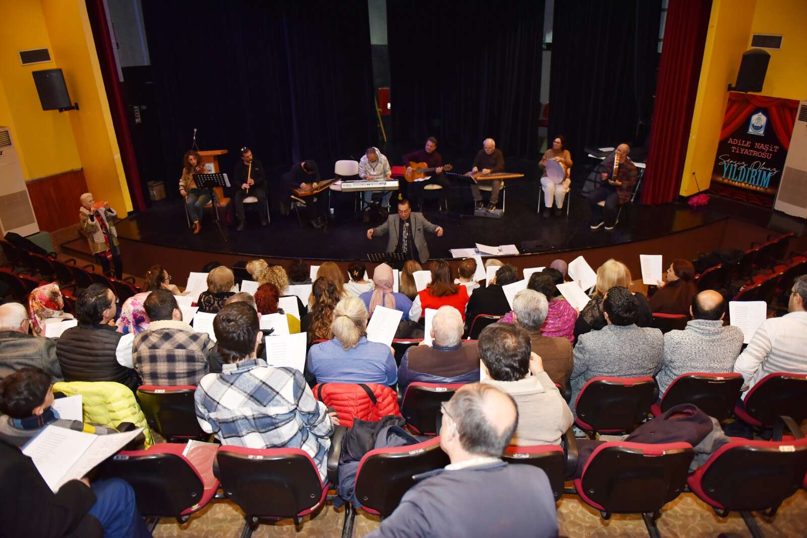 BURSA (İGFA) -Adile Naşit Tiyatrosu’nda 16 yaş ve üzeri Yıldırımlılar için ücretsiz düzenlenen çalışmalarda, Türk Sanat Müziği’nin ölümsüz eserlerini seslendiren kursiyerler, notalarla sözün en güzel buluşmalarını icra ediyor.