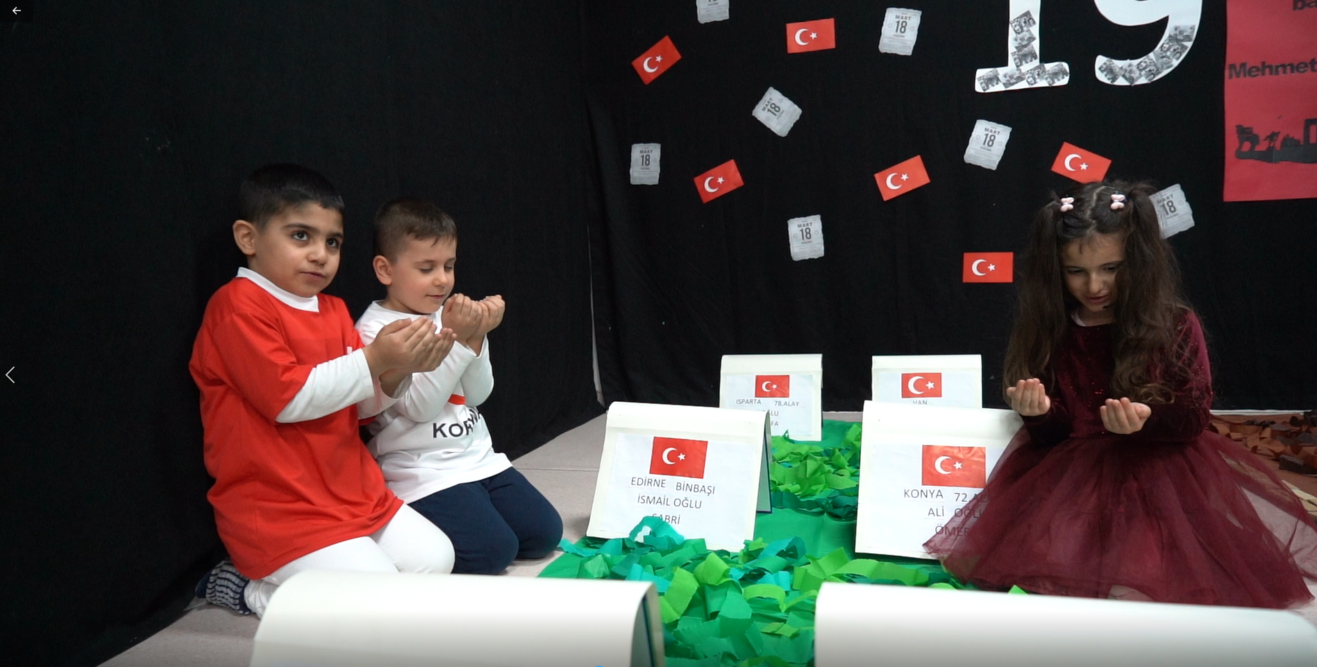 Kırmızı ve beyaza bürünen minikler ellerindeki Türk bayrakları ile tarihi zaferi büyük bir coşku ile kutladılar. Günün anlam ve önemine değinen şiirler okunarak koreografi gösterileri yapıldı. Çanakkale Zaferi’ni canlandıran minikler drama gösterisi ile tarihe yolculuk yaptılar. Çanakkale’de kadın, erkek, genç, yaşlı herkesin vatan için canla başla seferber olduğunu anlatan drama etkinliğinde cephede savaşan askerler, onlara yemek taşıyan kadınlar, savaşta yaralanıp tedavi gören askerler ve şehit düşen askerlere şehitlikte dua okunması birçok tarihi an canlandırıldı. Duygu dolu etkinlik İstiklal Marşımız ile tamamlandı.