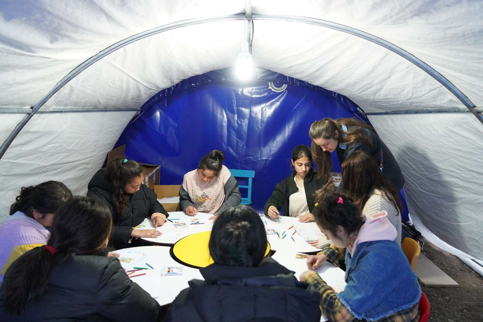 Çocukların yüzlerinin yeniden gülmesini sağlamak ve bu süreci psikolojik olarak da en az hasarla atlatmak için çalışmalarını sürdürdüklerini dile getiren Beylikdüzü Belediyesi uzman klinik psikologlarından Aslı Hilal Çiftçi, “Çadır kentimizde oluşturduğumuz alanlarda çocukların yanı sıra yetişkinlere de destek veriyoruz. Çocuk, öfke tepkisi gösterdiğinde ya da ağladığında onların da nasıl sakinleştireceğini bilmesi gerekiyor” diye konuştu. Yaptıkları grup çalışmalarında, danslarda, çizimlerde ve atölye çalışmalarında çocukların durumlarını gözlemleyip ona göre bireysel görüşmeler de gerçekleştirdiklerini söyleyen Çiftçi, “Bireysel görüşmelerde rahatlama egzersizleri yapıyoruz. Şu an hâlâ bitmeyen bir süreç var. Kriz dönemindeyiz. Aslında psikososyal ilk yardımdan bahsediyoruz. Bunun çocuklarda tramvaya dönüşmemesi, kronikleşmemesi için var gücümüzle çalışıyoruz” dedi.