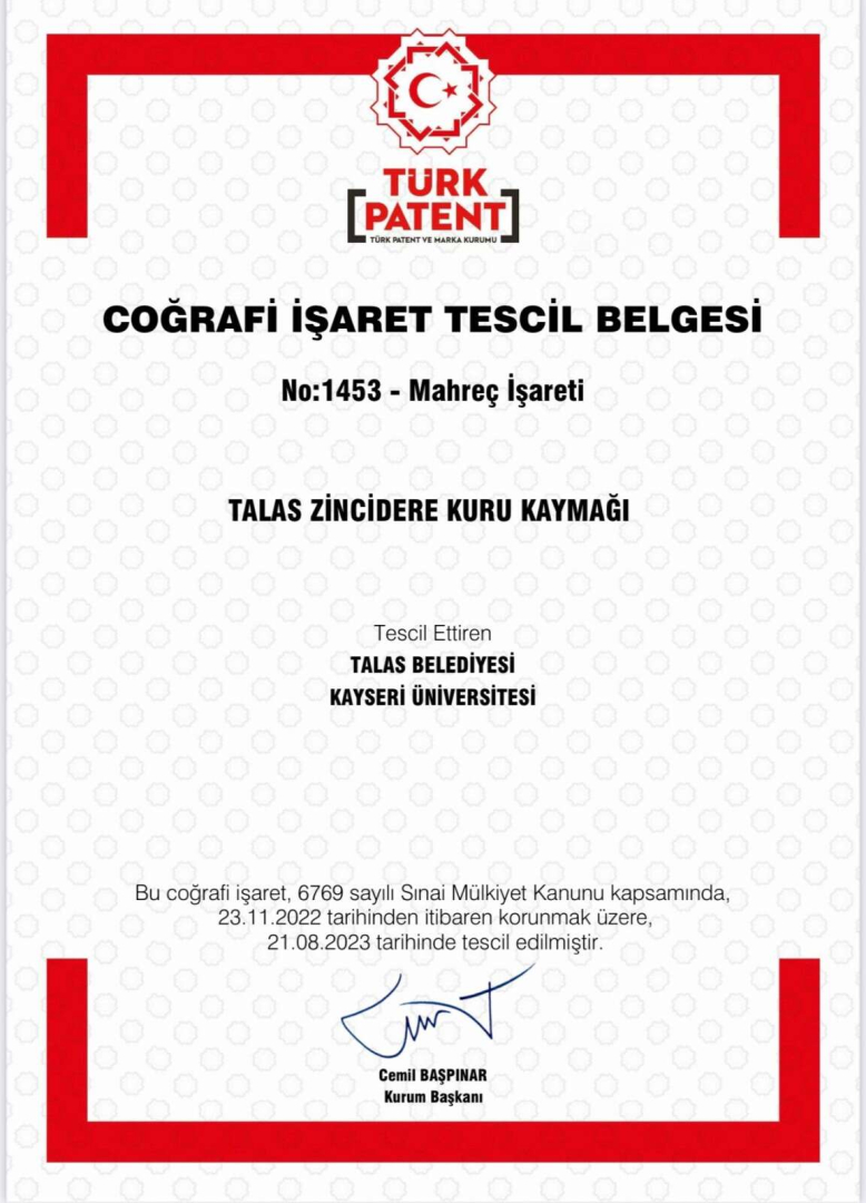 Bu yıl da Talas Belediyesi ile Türk Patent ve Marka Kurumu’na yaptığımız başvuru 21 Ağustos 2023 tarihi itibari ile neticelendi ve Talas İlçesine bağlı Zincidere Mahallesi’nde binbir zahmetle yapılan kuru kaymak, ‘Talas Zincidere Kuru Kaymağı’ olarak tescillendi. Zincidere Kaymağının coğrafi işaret almasında büyük emeği geçen Talas Belediye Başkanımız Mustafa Yalçın’a çok teşekkür ediyorum. Sadece Zincidere Kaymağı değil birçok üründe Talas Belediyesi ile ortak projelerimiz mevcut. Toplum faydasına yönelik ortak projelerimizi devam ettireceğiz. Talas Zincidere Kaymağının tescili hayırlı olsun” dedi.