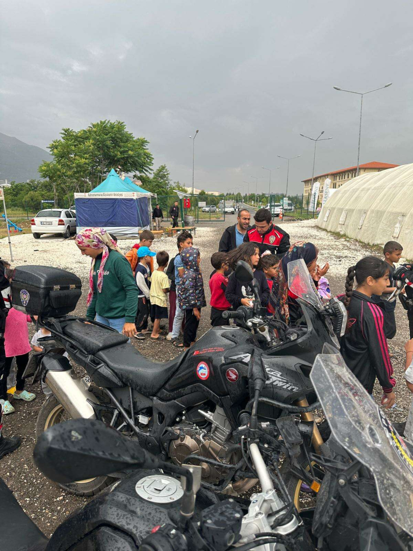 Erdoğan DEMİR / EDİRNE (İGFA) - 6 Şubat 2023 tarihinde meydana gelen depremin ardından Kahramanmaraş’ta geçici olarak görevli bulunan Keşan İlçe Emniyet Müdürlüğü Motosikletli Polis Timleri Personeli çocukları sevindirdi.