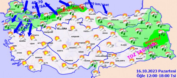 Ülkemiz genelinin parçalı ve çok bulutlu, Marmara, Karadeniz, Doğu Anadolu'nun kuzeyi ve doğusu ile Adana'nın ve Hatay'ın kıyı kesimlerinin sağanak yağışlı geçeceği tahmin ediliyor. Marmara ve Kuzey Ege ile Karadeniz kıyılarında kuvvetli (40-70 km/saat) olarak esmesi beklendiğinden yaşanabilecek olumsuzluklara karşı dikkatli ve tedbirli olunması uyarısı yapıldı.