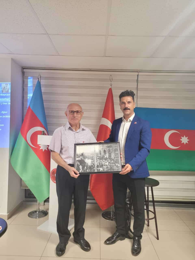 Söyleşi sonunda Karaköse'ye teşekkürlerini ileten Dernek Başkanı Şentürk Hoşgül, gecenin anısına Kafkas İslam Ordusu'nun Bakü'ye girişini gösteren tablo hediye etti.