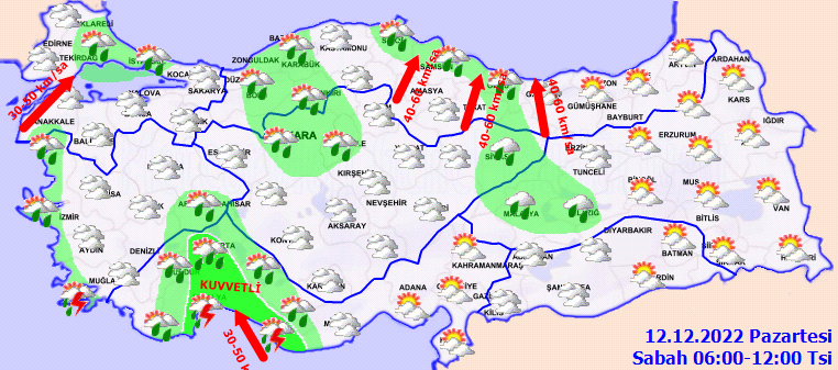 Hava Durumu: Parçalı ve çok bulutlu, aralıklı sağanak yağışlı, Rüzgar: Batı Akdeniz’de doğu ve güneydoğudan 6 ila 8, öğle saatlerine kadar yer yer 9, batısı güneybatıdan 4 ila 6; Doğu Akdeniz’de doğu ve kuzeydoğudan 4 ila 6, açıkları 7 kuvvetinde, Dalga: 1,5 ila 2,5 m, açıkları 3,0 m, batısı yer yer 3,0 ila 4,0 m; Görüş: Orta, yağış ve fırtına anında zayıf.