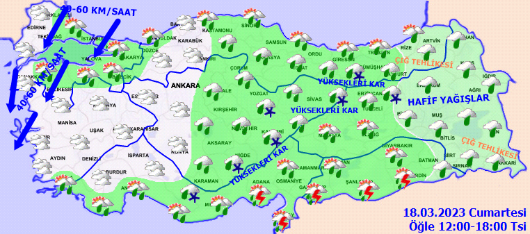 RÜZGAR: Yurdun batı kesimlerinde güneyli, doğu kesimlerde güneyli, zamanla kuzeyli yönlerden hafif, ara sıra orta kuvvete, Marmara ile Kıyı Ege’de kuzey ve kuzeydoğu yönlerden kuvvetli (40-60 km/saat) eseceği tahmin ediliyor.