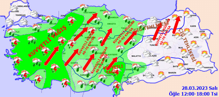 RÜZGAR: Genellikle güney ve güneybatı, Marmara'da kuzey ve kuzeybatı yönlerden hafif, ara sıra orta kuvvette, Marmara, Ege, Akdeniz'in iç kesimleri, İç Anadolu, Karadeniz'in iç kesimleri ile Doğu Anadolu'nun batısında kuvvetli ve fırtına (40-90 km/sa) şeklinde eseceği tahmin ediliyor.