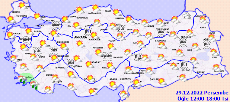 Ülkenin kuzey, iç ve güneybatı kesimlerinin parçalı ve çok bulutlu, Muğla, Trabzon ve Rize çevreleri ile Artvin'in kıyı kesimlerinin yağmur ve sağanak yağışlı, Artvin'in iç kesimleri ile Ardahan çevrelerinin karla karışık yağmur ve kar yağışlı geçeceği tahmin ediliyor. Marmara ile iç ve doğu kesimlerde yer yer pus ve sis bekleniyor.