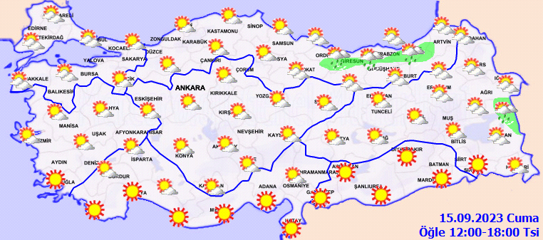 Ülkemizin kuzey ve doğu kesimlerinin parçalı, yer yer çok bulutlu, Doğu Karadeniz kıyılarının iç kesimleri, Ordu'nun iç kesimleri, Ağrı'nın güney, Van'ın kuzey ve doğu ilçeleri yerel sağanak ve gök gürültülü sağanak yağışlı, diğer yerlerin az bulutlu ve açık geçeceği tahmin ediliyor.