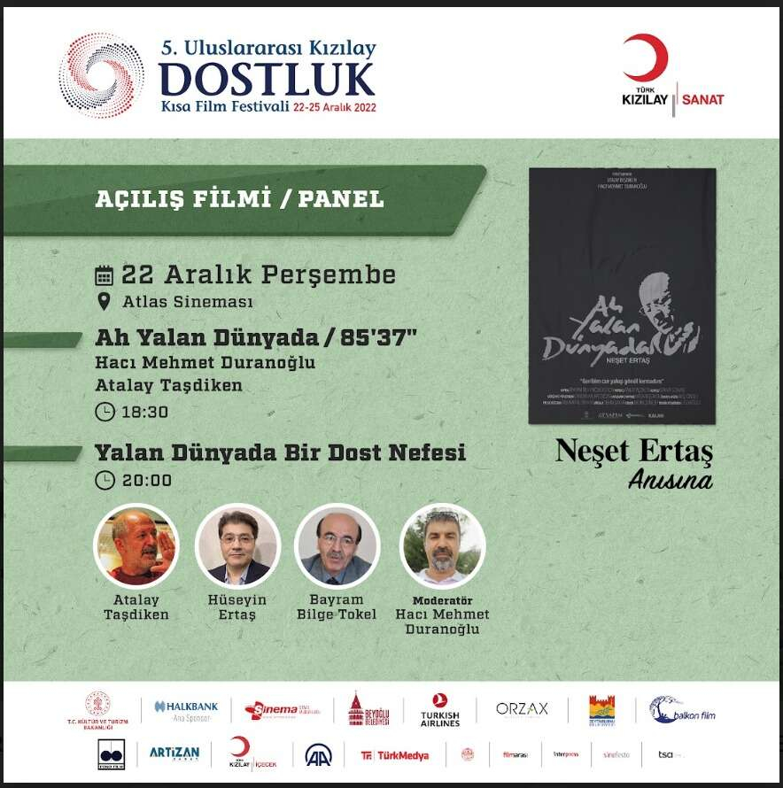 Kızılay Dostluk Kısa Film Festivali ‘Neşet Ertaş’ belgesel gösterimi ile açılıyor Uluslararası Kızılay Dostluk Kısa Film Festivali, 22-25 Aralık 2022 tarihleri arasında sinema severlerle buluşacak.