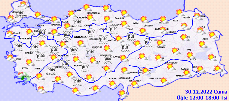Ülkenin batı kesimlerinin parçalı bulutlu, öğlen ve akşam saatlerinde Muğla kıyıları ile gece saatlerinde Aydın çevrelerinin hafif sağanak yağışlı, diğer yerlerin az bulutlu ve açık geçeceği tahmin ediliyor. Sabah ve gece saatlerinde Marmara ile iç ve doğu kesimlerde yer yer pus ve sis bekleniyor.