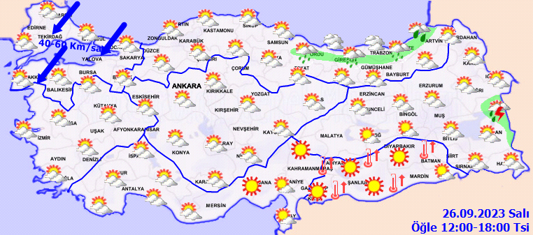 RÜZGAR: Genellikle kuzeyli, yurdun güney kesimlerinde güneyli yönlerden hafif, ara sıra orta kuvvette, Marmara ve Kuzey Ege'de kuzey ve kuzeydoğu yönlerden kuvvetli (30-60 km/saat) esmesi bekleniyor.