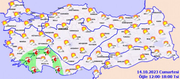 Ülkemizin güneybatı kesimlerinin parçalı, yer yer çok bulutlu, öğle saatlerinden sonra Muğla, Denizli, Isparta, Burdur'un batısı, Afyonkarahisar'ın güneyi, Antalya'nın çevre ilçeleri ile gece saatlerinde Adana, Kahramanmaraş, Osmaniye, Gaziantep, Kilis, Mersin'in doğusu, Kayseri'nin güneyi ve Şanlıurfa'nın batı kesimlerinin yerel sağanak ve gök gürültülü sağanak yağışlı, diğer yerlerin az bulutlu ve açık geçeceği tahmin ediliyor. Sabah ve gece saatlerinde Marmara’nın güney ve doğusu, İç Ege ile Karadeniz’in iç kesimlerinde yer yer pus ve sis hadisesi bekleniyor.