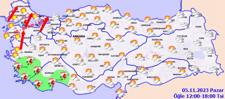 Güney Ege ile Bartın, Zonguldak, Bolu, Düzce, Antalya çevreleri ile Isparta'nın güney kesimleri ve Burdur'un güney ve doğusunun ile Adana'nın doğusu ve Osmaniye'nin batı kesimlerinin sağanak ve yer yer gök gürültülü sağanak yağışlı geçeceği tahmin ediliyor. Yağışların, Muğla çevrelerinde yer yer kuvvetli olması bekleniyor.