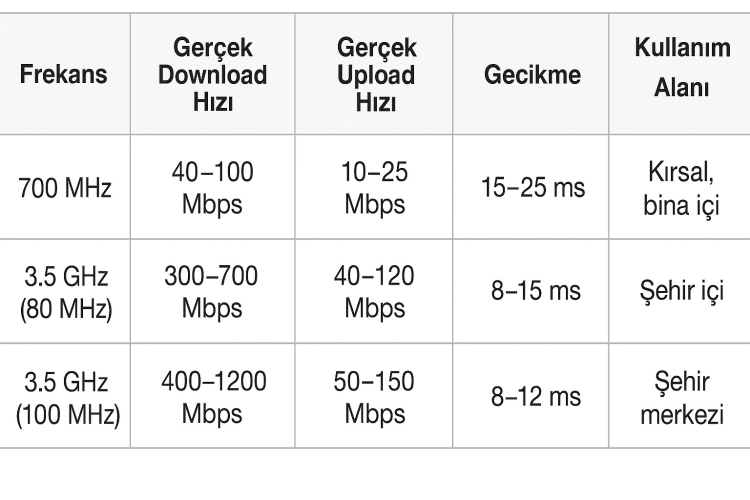 3.5 GHz (80 MHz TDD): Orta kapsama alanı, yüksek hız. Şehir içi kullanım için ideal.
