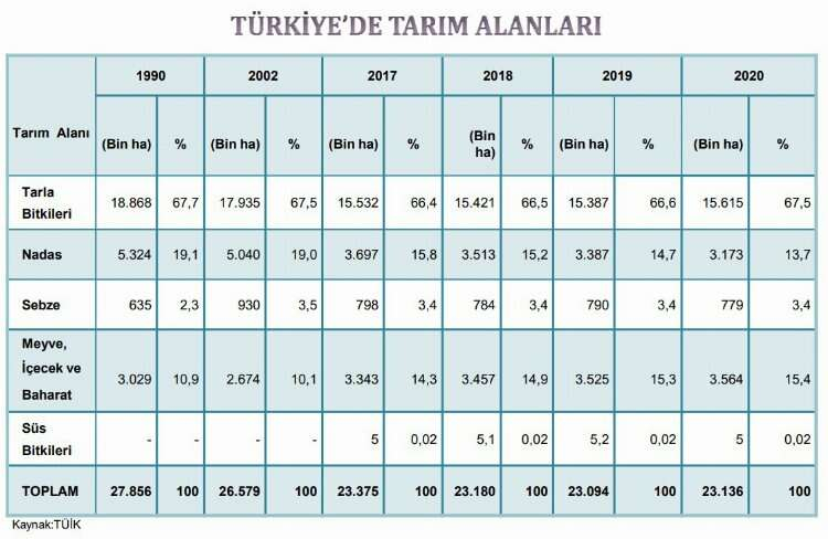 1990 yılında 27 milyon 856 bin hektar olan tarım alanı, 2020 yılında 23 milyon 136 bin hektar olarak açıklanmıştı. Bu rakam 2022 yılında 19 milyon 572 bin hektara düştüğü belirtiliyor.