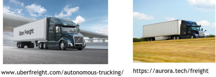 Uber'den ayrılan lojistik şirketi Uber Freight da otonom kamyonculuğa (tırcılığa) büyük yatırım yapıyor . Şirket, Uber Freight taşıyıcı filosunu geliştirmek için otonom kamyon (tır) şirketi Aurora Innovation da dahil olmak üzere dört otonom sürüş teknolojisi oyuncusuyla ortaklık kurdu. Bu kapsamdaki çalışmalarını tamamlayan Aurora, Mayıs’ın ilk haftasındaDallas'tan Houston'a giden sürücüsüz kamyonları (tırları) hizmete soktu ve sürücüsüz müşteri teslimatlarına başladı (https://ir aurora tech/news-events/press releases/detail/119/aurora-begins-commercial-driverless-trucking-in-texas).