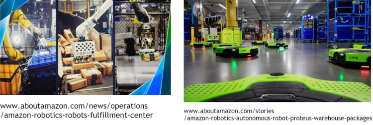 Amazon Robotics , depolarında paketleri ayıran, kaldıran ve taşıyan sekiz farklı robot geliştirdi . Bunlar arasında , dağıtım merkezlerinde büyük paket arabalarını kamyonlara yüklemek üzere tasarlanmış, Amazon'un ilk tamamen otonom mobil robotu Proteus da yer alıyor.