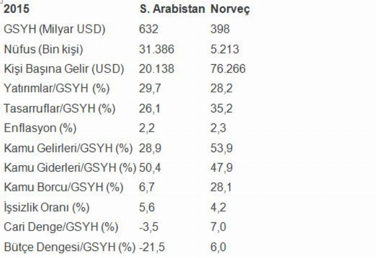 Tablodan görüleceği gibi Suudi Arabistan, Norveç’ten yaklaşık 1,6 kat daha fazla GSYH’ya ve 6 kat daha fazla nüfusa sahip bir ekonomi.