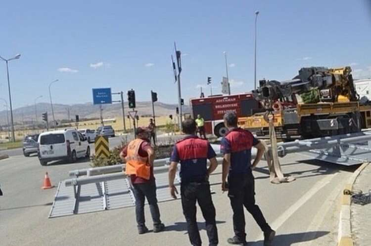 Adıyaman Eğitim ve Araştırma Hastanesi kavşağında yapılacak olan batı çıktı çalışmalarında şehir için tabelalarını vinç ile kaldırılması sırasında vinç üzerindeki tabelanın yüksek gelirim tellerine temas etti.