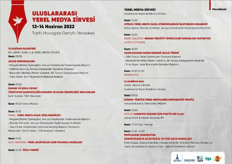 EFJ genel kuruluna paralel olarak yine Havagazı Fabrikası’nda İzmir Büyükşehir Belediyesi’nin ev sahipliğinde Uluslararası Yerel Medya Zirvesi düzenlenecek. Türkiye Gazeteciler Sendikası (TGS) ve İzmir Gazeteciler Cemiyeti (İGC) tarafından hayata geçirilen zirveye, Türkiye’den 50 basın meslek örgütü temsilcisi katılacak. Zirve yerel medyanın güçlenmesine aracılık etmeyi amaçlıyor.