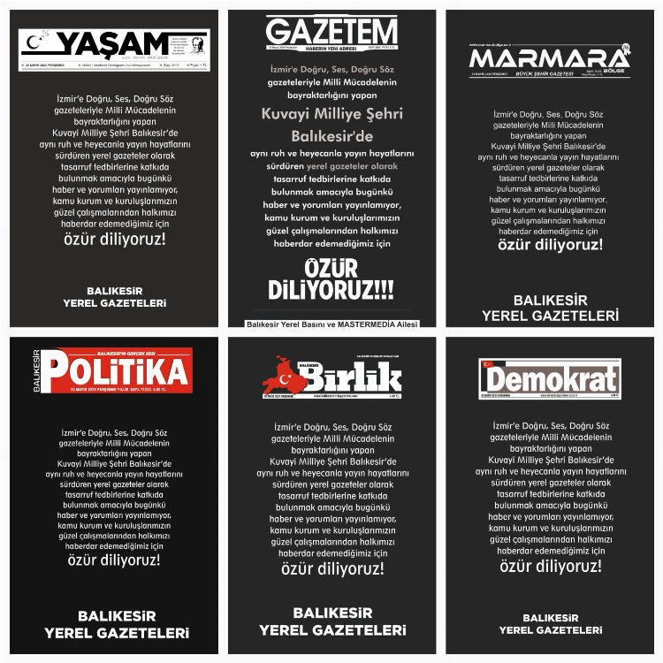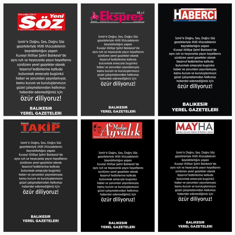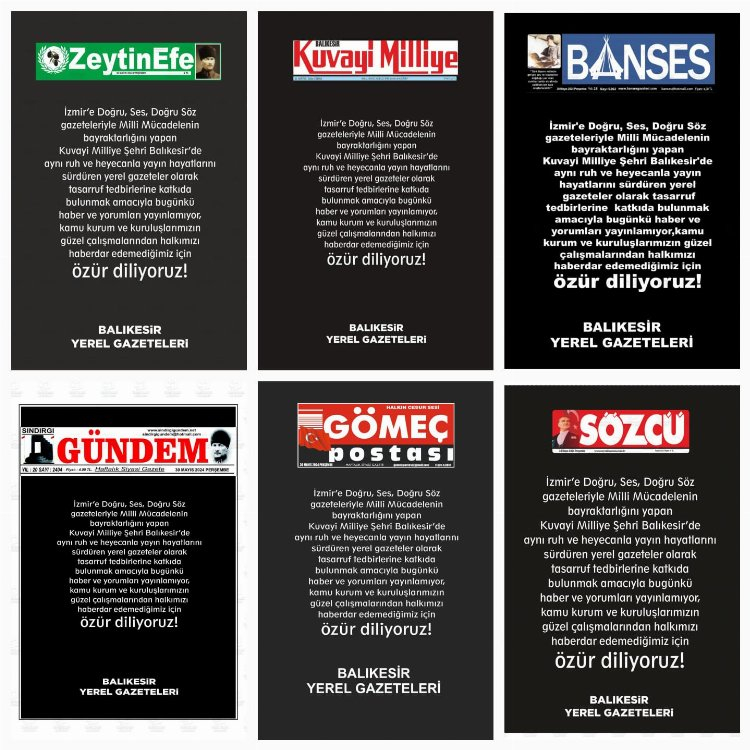 Yerel gazeteler, bugünkü gazete manşetlerinde ve internet haber sitelerinin manşetlerinde, “İzmir’e Doğru, Ses, Doğru Söz gazeteleriyle Milli Mücadelenin bayraktarlığını yapan Kuavyi Milliye Şehri Balıkesir’de aynı ruh ve heyecanla yayı hayatlarını sürdüren yerel gazeteler olarak tasarruf tedbirlerine katkıda bulunmak amacıyla bugünkü haber ve yorumları yayınlamıyor, kamu kurum ve kuruluşlarımızın güzel çalışmalarından halkımızı haberdar edemediğimiz için özür diliyoruz. Balıkesir Yerel Gazeteleri.” ifadelerine yer verildi.