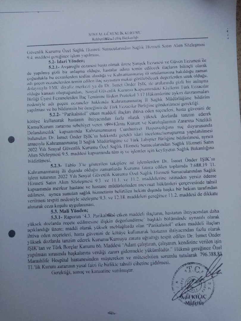 Kahramanmaraş Tabipler Odası'nda yaklaşık 2017 yılının ortalarında bu konuyla basında çıkan o dönemdeki basında çıkan haberler neticesinde bu ilgili hekimin dosyası gitmişti ancak bu ilgili hekimin o dönemde soruşturma açılması yönünde bir karar çıkmış, Herhangi bir cezai işlem veya uygulamadığını biliyoruz diyen Sağlık Dünyası Derneği Başkanı Hanifi Çöplü, “Şuan da teftiş kurulu başkanlığının gönderimiş olduğu rapor tabipler odasına da gitti. Bu hekim ve hekimler adına hangi cezaları uygulayacak bu yapılan yanlışların hesabı buradan da sorulacak mı bunlarda merakla takip ediyoruz. Sosyal güvenlik kurumu yine aynı 2016, 2017 basında çıkan haberler neticesinde sosyal güvenlik kurumuna tabipler odası Gaziantep’e giden hastaların kayıtlarının gittiğini ancak giden hastaların kayıtlarının Gaziantep’e giden değil Kahramanmaraş’ta bulunan hastaların özellikle mi oraya gönderildiğini Gaziantep’e gidip sağlık kurulu raporu çıkartıp veya diyaliz raporu çıkartan hastaların neden incelenmediği noktasında buraya da ayrı bir parantez açıp 2022 yılında bu yıl içerisinde teftiş kurulu raporunda çıktığı üzere hastaların reçetelerine sosyal güvenlik kurumu sonuçta ilgilendiren bir kurum orayı bu reçeteler bir eczaneye yönlendirilmesi veya seçilen eczanelere yönlendirilmesi noktasında sosyal güvenlik kurumu hangi işlemleri yapacak bunu da merakla bekliyoruz” ifadelerini kullandı.