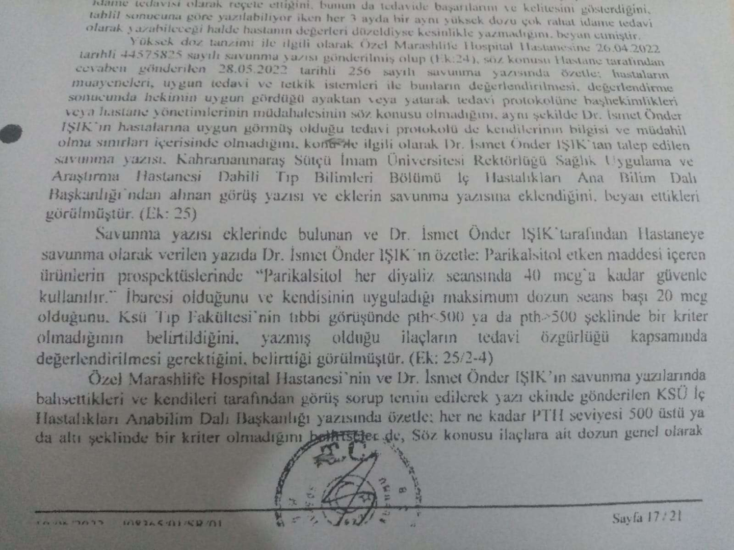 Birçok sağlık alanından şikayetin geldiğini kendilerinin de şikayette bulunduğunu dile getiren Sağlık Dünyası Derneği Başkanı Hanifi Çöplü, “Kahramanmaraş’ta diyalize giren 60 hastanın sağlık kurulu raporları Kahramanmaraş’ta çıkartılmayıp Gaziantep’te çıkmasına yönelik şikayetlerimiz oldu. İl sağlık müdürlüğü bu konu hakkında bir soruşturma yapmışmıdır?, yaptı ise sonucunu kamuoyuna paylaşmamıştır, paylaşmaması nedeni ile bu olaylar zinciri 2022 yılına kadar devam etmiştir. KSÜ Tıp fakültesi bildiği üzere diyaliz hizmeti satın alıyor. Yaklaşık 15 yıldır da aynı firma üzerinden diyaliz hizmetleri satın alınıyor. Biz defalarca orada tek firmaya çıkan ihalelerin yanlış olduğunu ve içerisinde birçok maddenin bu firmayı işaret ettiğini de belirtmiştik. İlgili konu ile alakalı cimer şikayetinden görüleceği gibi hastaların oradan ilk başlanan hastaların kendi firmalarına kendi diyaliz merkezine yönlendirme yapıldığını ve söylemezdi üzerine konu ile alakalı kurumlara şikayet dilekçesi de verilmiştir. Bunun üzerine diyaliz merkezi Dr. İsmet Önder Işık hekimi tarafından soruşturmanın ilk başlandığı süreçte KSÜ Tıp Fakültesi Nefoloji Bilim Dalı'ndan görüş yazısı alınarak müfettiş raporunun içerisine konulduğu görülmektedir. Bunun içerisinde 3 üniversitesinin daha görüşü var ancak bu 3 görüş sosyal güvenlik kurumunun resmî istediği görüş ama KSÜ Tıp Fakültesi'nin Nefoloji Bölümü'nden alınan görüş gayri resmî hekimin aldığı görüş. Bu görüş içerisinde de hastaların kullandığı kemik iğnelerinin limitleri yazılmış ve oda yüksek miktarda olabilir kullanmasında bir sakınca yoktur gibi bir ibare atılmıştır. Burada bu hekimi korumak için mi yapıldı veya buraya kim talimat verdi. Nereden geldi bu yazı diye KSÜ Tıp Fakültesi'ne de bu soruyu iletiyoruz” diye konuştu.