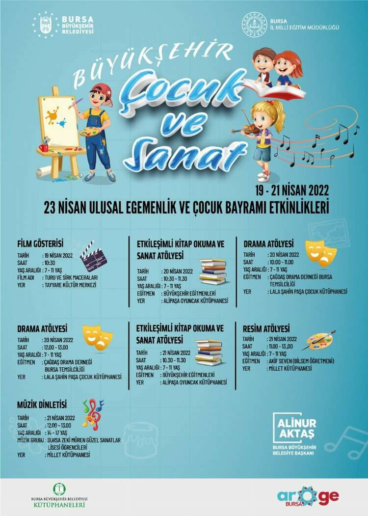 BURSA (İGFA) - Bursa Büyükşehir Belediyesi ve İl Milli Eğitim Müdürlüğü işbirliğinde hazırlanan ’23 Nisan Ulusal Egemenlik ve Çocuk Bayramı’ temalı programda; çocuk sineması gösterimi, sanat atölyeleri, drama atölyesi, resim atölyesi ve müzik dinletileri gibi faaliyetlerle yüzlerce çocuk aynı ortamda keyifli vakit geçirmek imkanı bulacak.