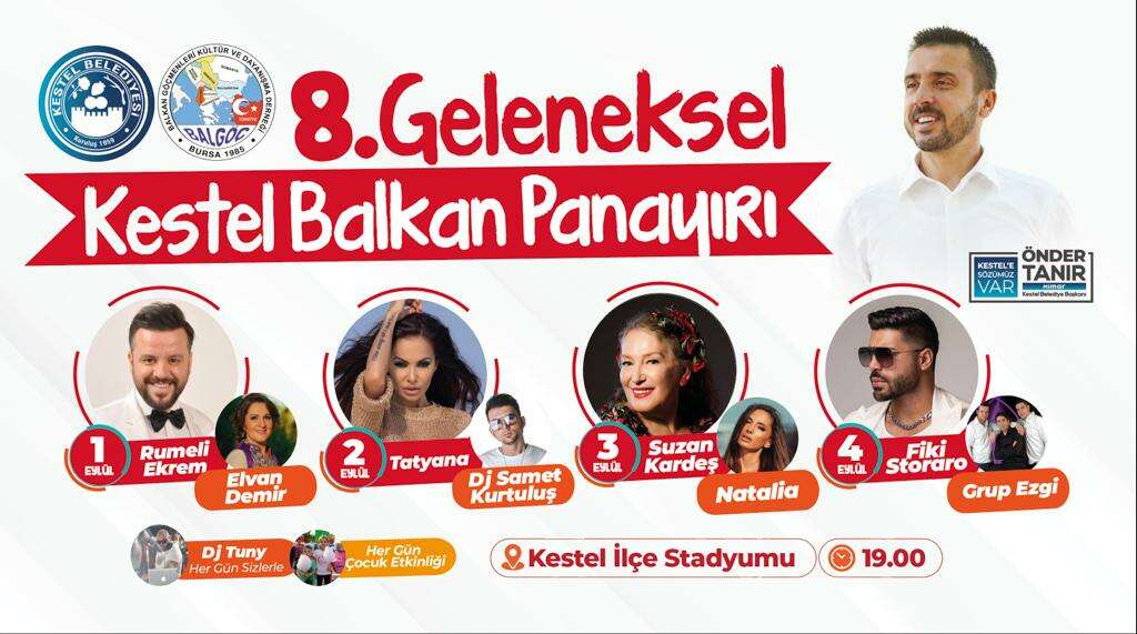 BURSA (İGFA) - 1-4 Eylül tarihleri arasında Kestel Yeni Mahalle İlçe Stadyumunda 4 gün sürecek olan Kestel Belediyesi 8.Geleneksel Balkan Panayırında Rumeli Ekrem, Tatyana, Suzan Kardeş, Elvan Demir, Dj Samet Kurtuluş, Natalia, Grup Ezgi, Dj Tuny sahne alacak.