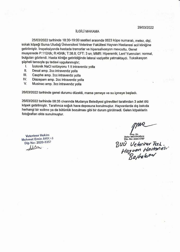 Tremorlar ve hipersalivasyonların mevcut olduğu hayvanların ertesi gün genel durumu düzelerek mama yemeye ve su içmeye başladığı kaydedilen Başhekim Zafer Mecitoğlu ve Veteriner Hekim Mehmet Emin Akkaş imzalı raporda, 26 Mart tarihinde ise Mudanya Belediyesi görevlileri tarafından 3 adet ölü köpek getirildiği belirtildi.