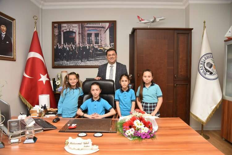 Makamında küçük konuklarını ve okul öğretmenlerini ağırlayan Milas Belediye Başkanı Muhammet Tokat, Belediye çalışmaları hakkında bilgi aktardı ve Sıdıkanaz nezdinde tüm çocukların 23 Nisan Ulusal Egemenlik ve Çocuk Bayramlarını tebrik etti. 23 Nisan’ın hem milli egemenlik hem çocuk hem de bayram olgularını bir arada barındırıyor olması itibariyle tarihimiz açısından çok önemli bir gün olduğunun altını çizen Başkan Tokat , “Geleceğimizin teminatı olan çocuklarımızın, Cumhuriyet’imizin Kurucusu Mustafa Kemal Atatürk’ün izinde, toplumumuzun her alanındaki ileri atılımlarına öncülük yapacak, kalpleri vatan ve millet sevgisiyle dolu, görev ve sorumluluklarına yürekten bağlı, düşünceli insanlar olarak yetişmesi en büyük temennimizdir.” dedi.