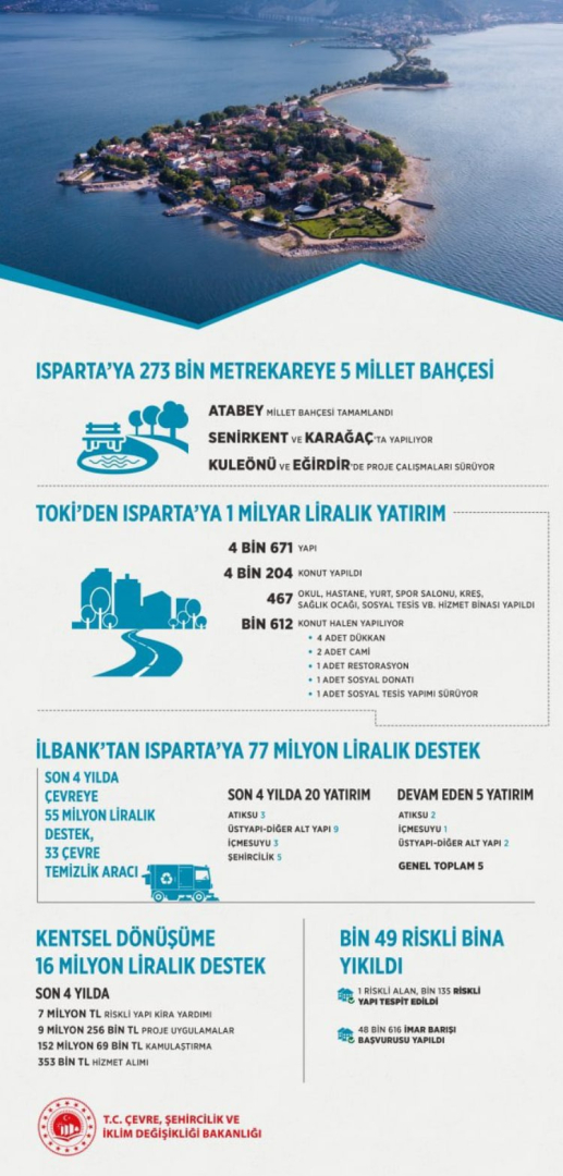 TOKİ tarafından Isparta’ya 1 milyar liralık yatırım yapıldığının altını çizen Bakan Kurum, kentsel dönüşüme 16 milyon liralık destek verildiğini, İlbank’tan 77 milyon liralık destek verildiğini söyledi.