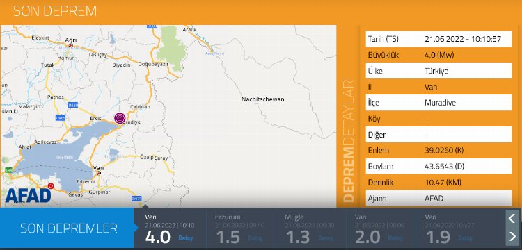 ANKARA (İGFA) - AFAD internet sitesinde yer alan bilgiye göre, Van'ın Muradiye ilçesinde saat 10.10'da 4,0 büyüklüğünde deprem kaydedildi.
